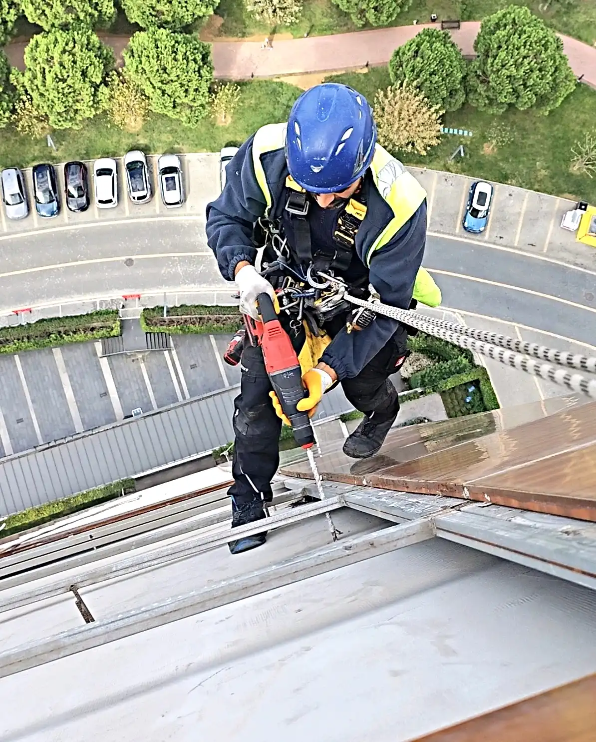- Güvenli Erişim ve Çalışma Platformu: İskele kurulumuna ve mobil vinç kiralamaya gerek kalmadan, endüstriyel dağcılar halatlı erişim sistemleriyle yüksekte çalışma yapar. Bu yöntem, özellikle dar alanlarda ve yoğunluğun çok olduğu şehir merkezlerinde (İstanbul gibi) zaman ve maliyet tasarrufu sağlar.